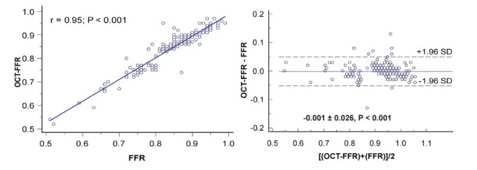 ● Concordanza: L'OCT-FFR ha mostrato un'eccellente concordanza con l'FFR invasivo. I valori medi erano identici (0,85 ± 0,08 per entrambi i metodi), con una forte correlazione (Pearson r = 0,95, P < 0,001). L'analisi di Bland-Altman ha ulteriormente confermato un'elevata coerenza (differenza media −0,001 ± 0,026, P < 0,001).